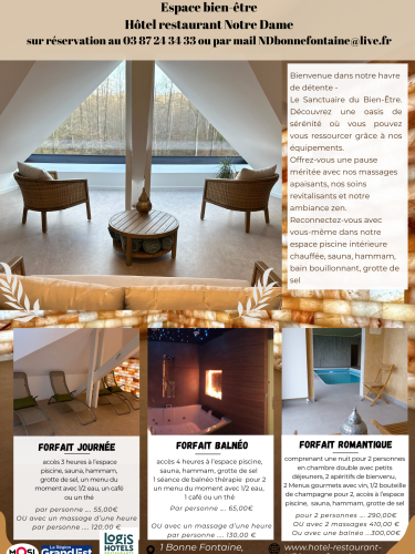 4-hour spa access, pool, sauna, steam room, salt grotto, 1 balneotherapy session for 2, a menu of the moment with 1/2 water, I coffee or l tea or 130 € with a one-hour massage